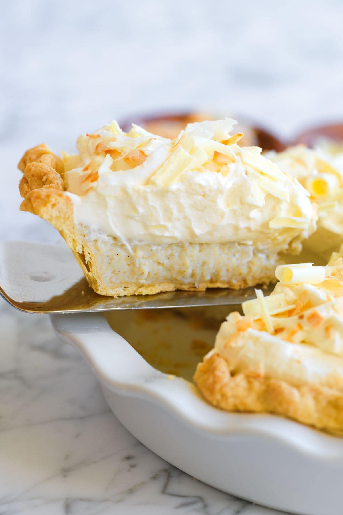 - White Chocolate: Adding white chocolate shavings to the top was inspired by a mini coconut cream pie I had at Dahlia Bakery in Seattle. They’re pretty famous (and for good reason). They add white chocolate, and it always stuck with me, so here I am today suggesting you do the same for your pie!