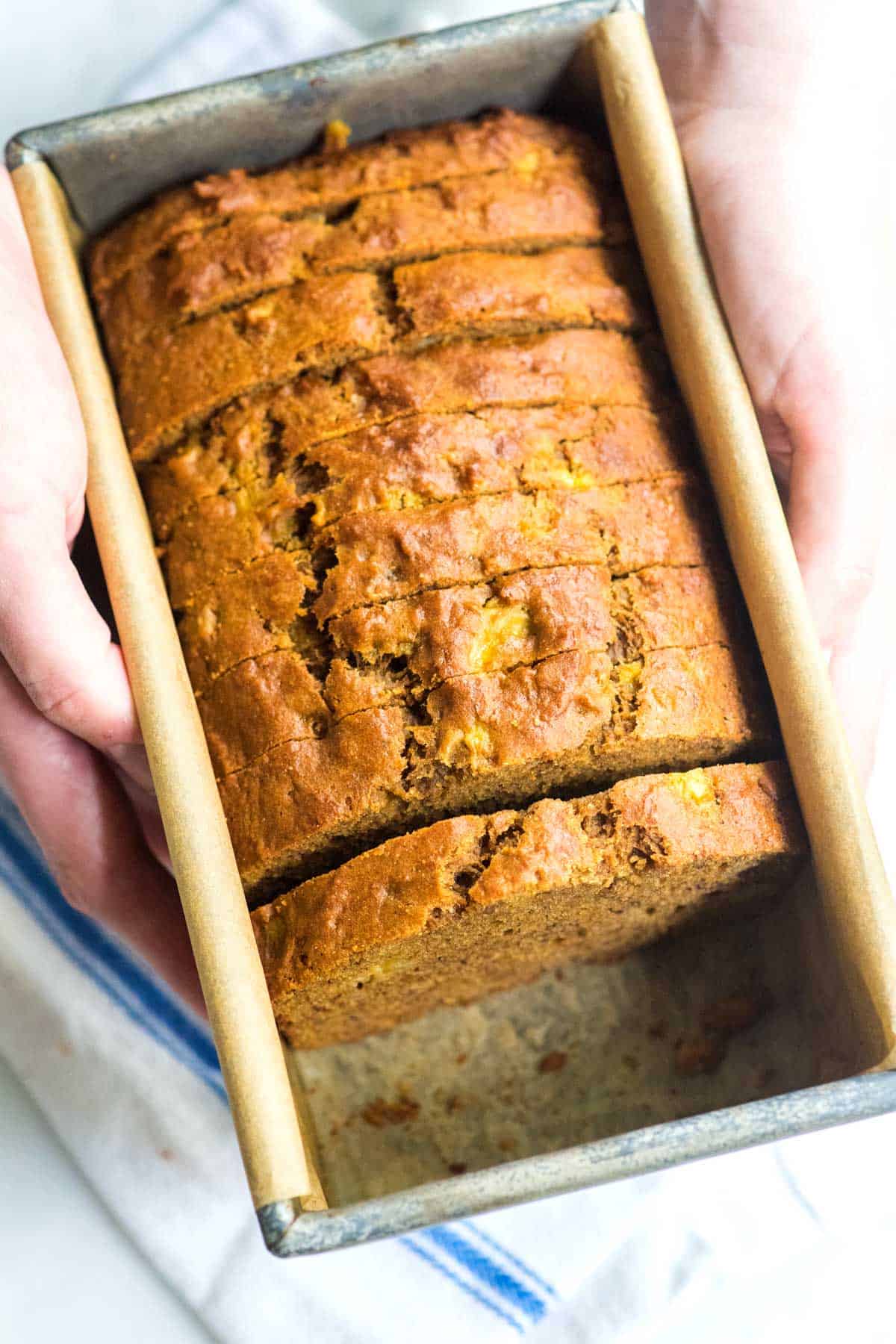 This lighter banana bread is super moist, dense, and really delicious.