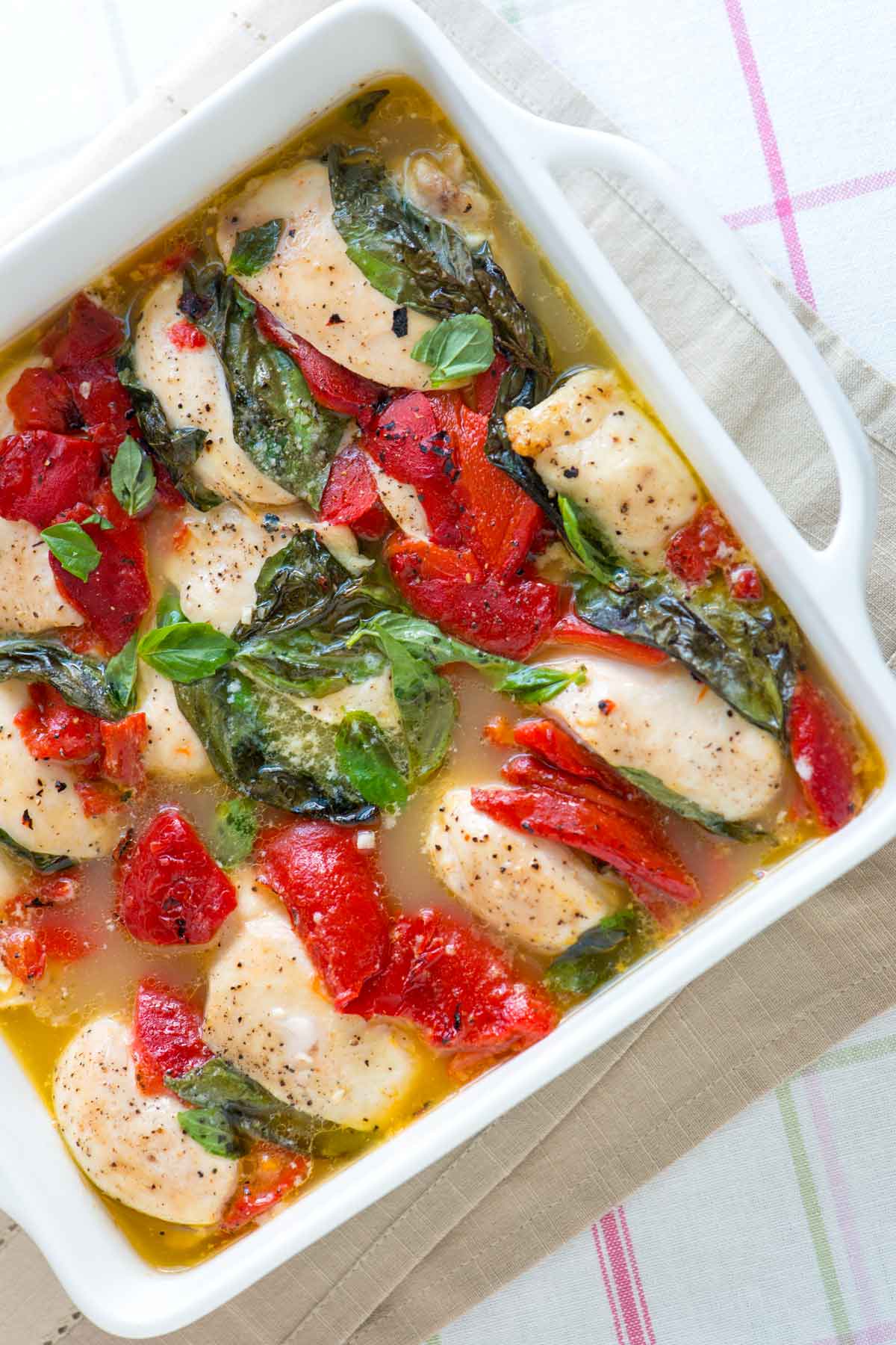 Whatever we call it, you’ll line up sliced chicken breasts, alternating them with roasted red peppers and basil, then pour over your citrus broth and bake. You can see how in our photo above. So easy, and that liquid you see around the chicken is pure gold! Don’t leave it behind. It’s great over rice or just slurped with a spoon.