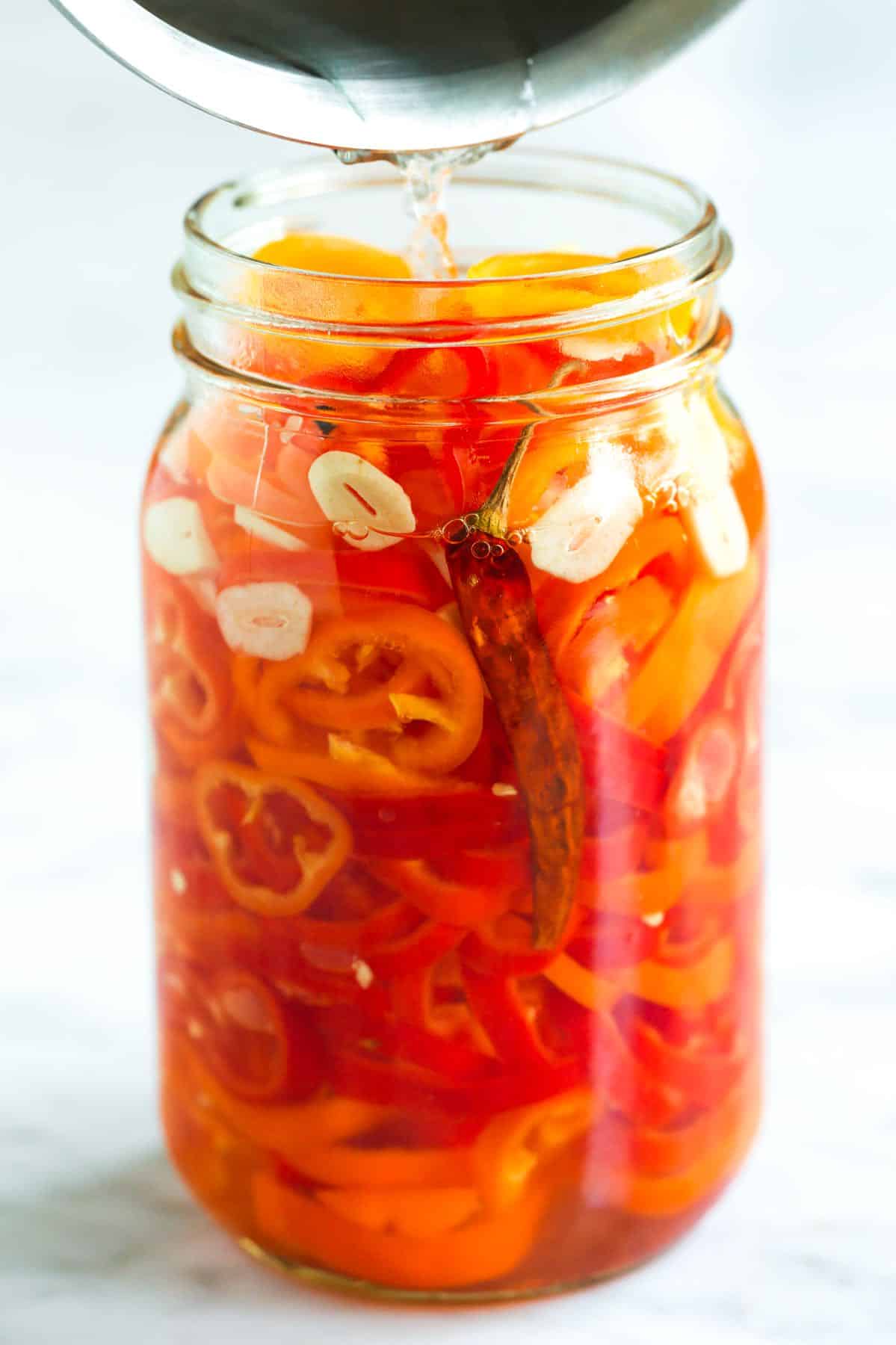 4Pour the brine into the jar: Pour the vinegar brine over the peppers. Make sure the brine completely covers all the peppers. Secure the lid on the jar until it’s “finger-tight” (meaning snug but not overly cranked).
