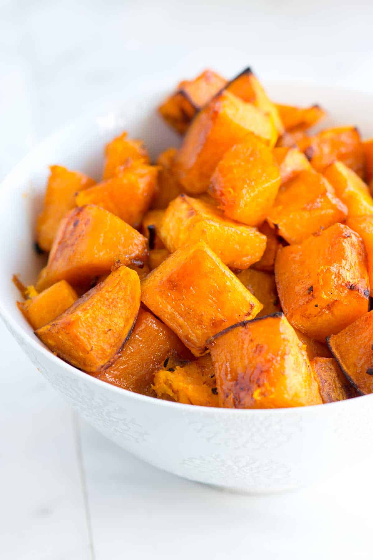 We love this roasted butternut squash recipe. We toss the squash with a touch of brown sugar and spices so it caramelizes in the oven and becomes super flavorful!