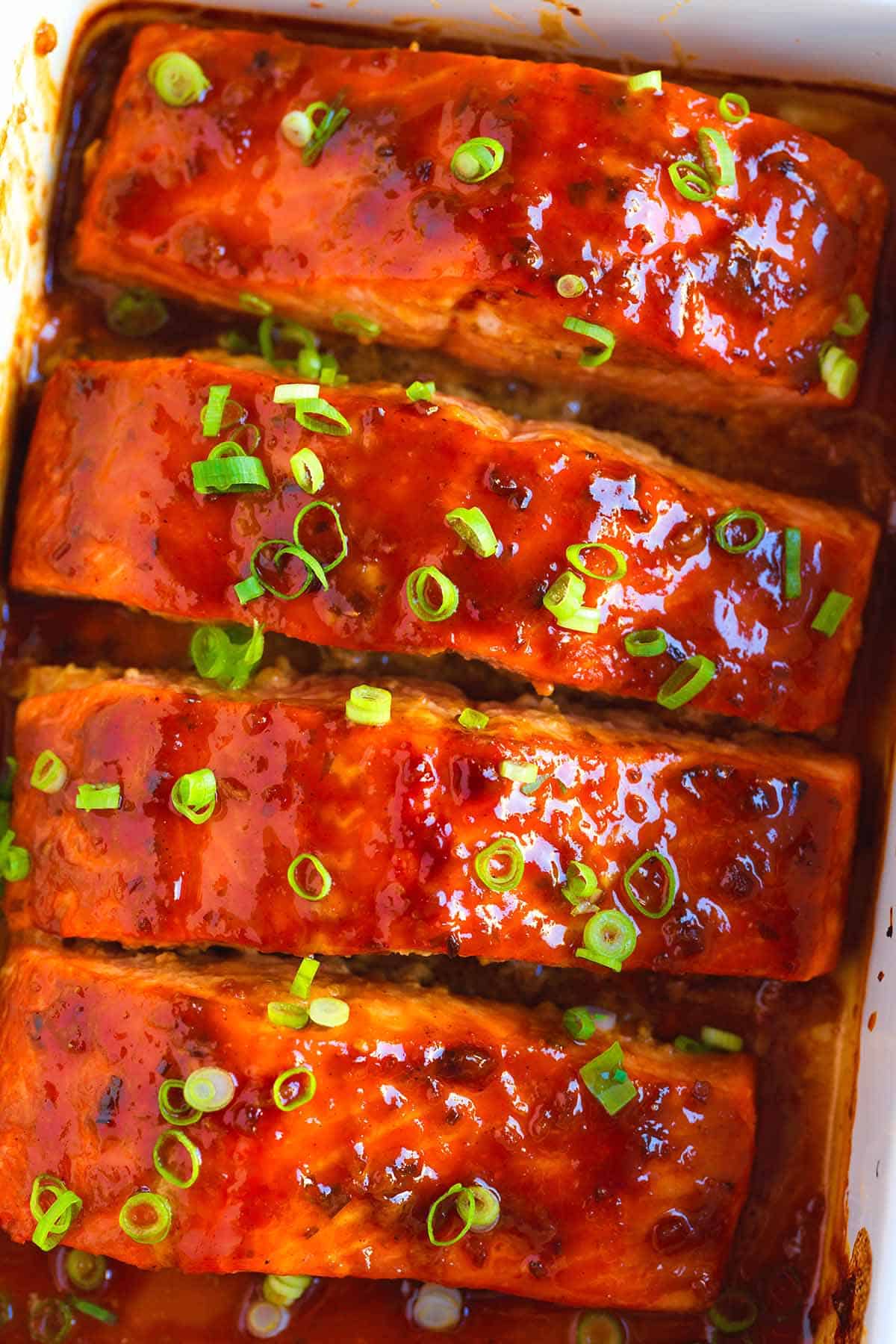 5Glaze as it bakes: Every 3 to 5 minutes, tilt the dish slightly to gather the glaze that’s pooled at the bottom and spoon it back over the salmon. This step helps you achieve that beautifully sticky, caramelized finish. Top with sliced green onions and serve.