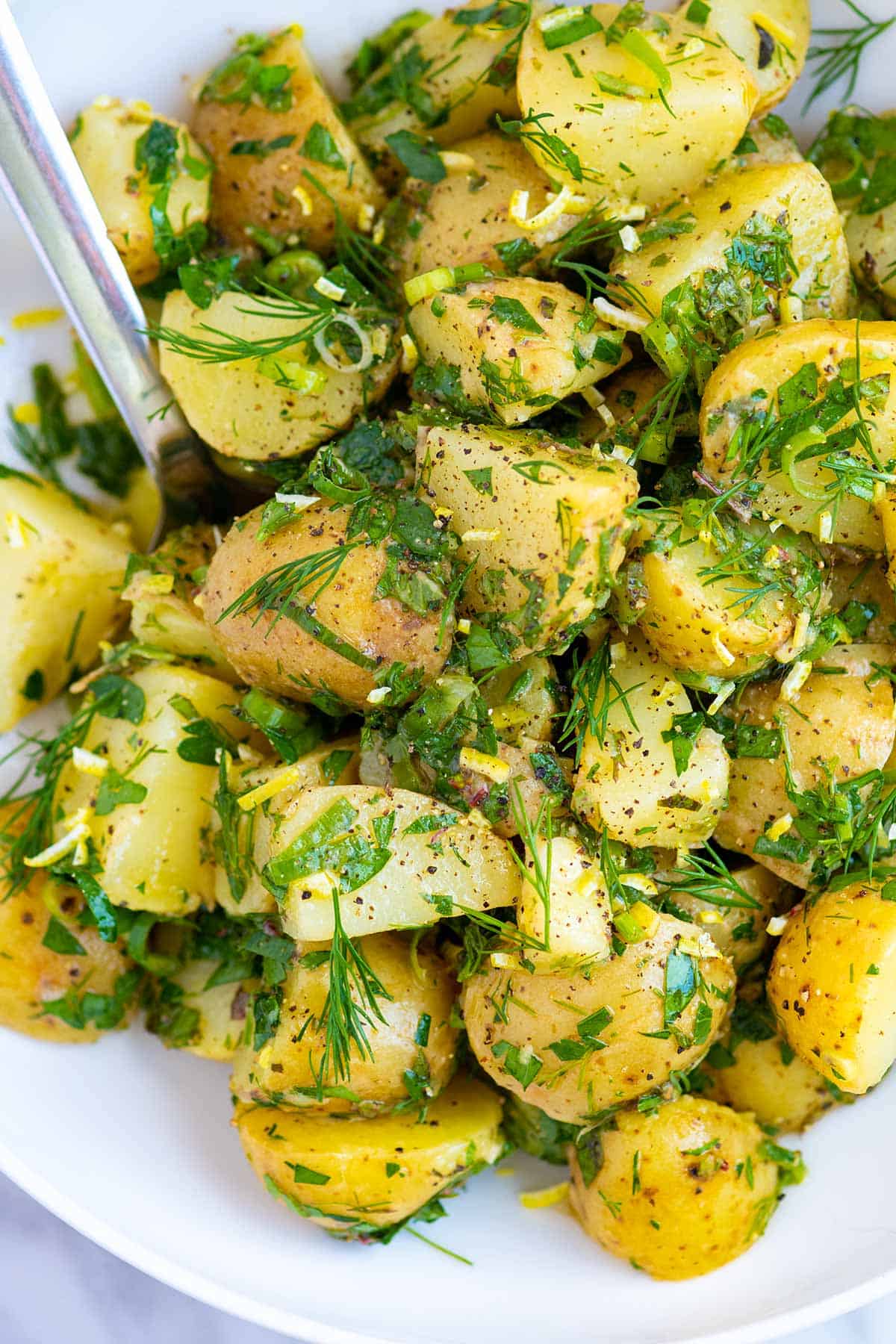 Our no mayo herb potato salad is packed with flavor thanks to a simple olive oil vinaigrette, lots of fresh herbs, and lemon. We prefer to use small baby potatoes (sometimes labeled New Potatoes), fingerling potatoes, or Red Bliss potatoes for this salad.