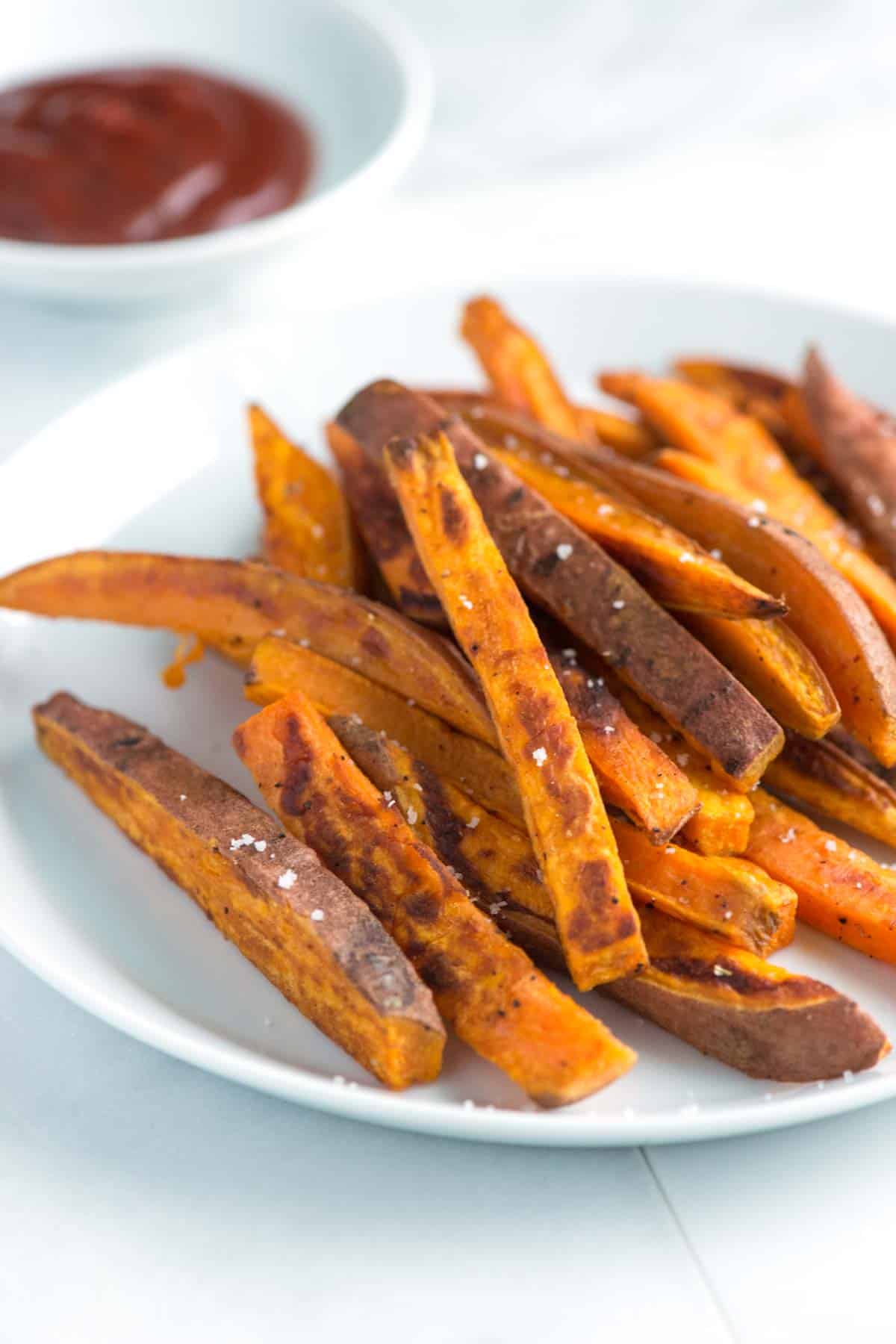 This is my favorite sweet potato fries recipe. The fries bake up with caramelized edges and tender centers every time. Watch our recipe video to see exactly how we cut the sweet potatoes into fries. I like to keep the skins on for extra texture and flavor, but you can peel them if you prefer.