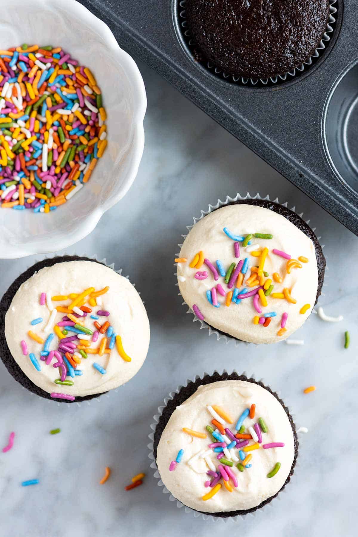- Frosting: I’ve shown our simple vanilla buttercream in the photos. It calls for butter, powdered sugar, cream, and vanilla. For a vegan version, substitute plant-based butter and non-dairy milk (it’s slightly softer, but still delicious). I also love this chocolate buttercream if you’d like more chocolate.
