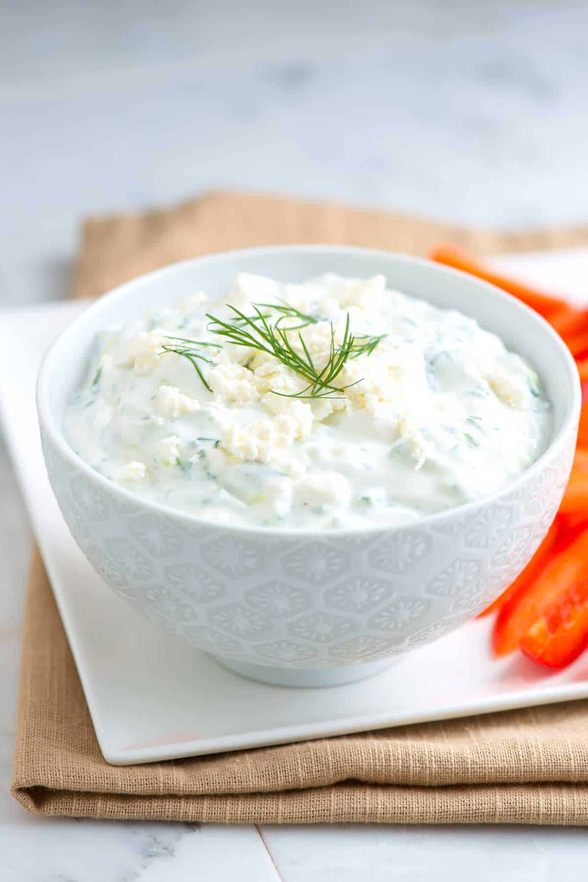 We love this thick, creamy yogurt sauce with fresh cucumber, lemon, dill, and feta cheese. It’s brightly flavored and perfect for serving with veggies, pita chips, grilled meats, and even sandwiches. There are two options for the yogurt. The easiest is to use Greek yogurt. However, you can also use strained plain yogurt. To strain yogurt, place it in a fine mesh strainer lined with cheesecloth or paper towels and rest it over a bowl. Place the yogurt into the refrigerator for 3 to 4 hours to drain. Then, discard the liquid.