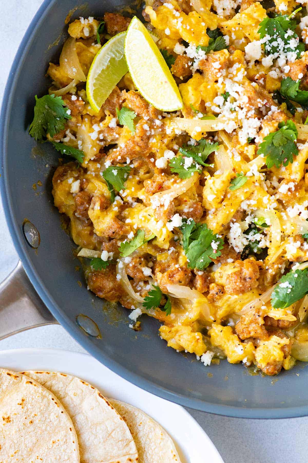 I usually serve chorizo and eggs family-style with warm tortillas. If you’re up for it, try homemade flour tortillas or corn tortillas.
