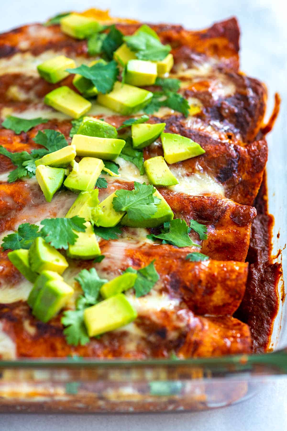 I love serving these enchiladas with some chopped avocado and fresh cilantro, but there are so many ways to top them. For a little crunch, try scattering some chopped tomatoes, diced onions, diced jalapeños, sliced green onions, black olives, or even shredded cabbage or lettuce over the top.