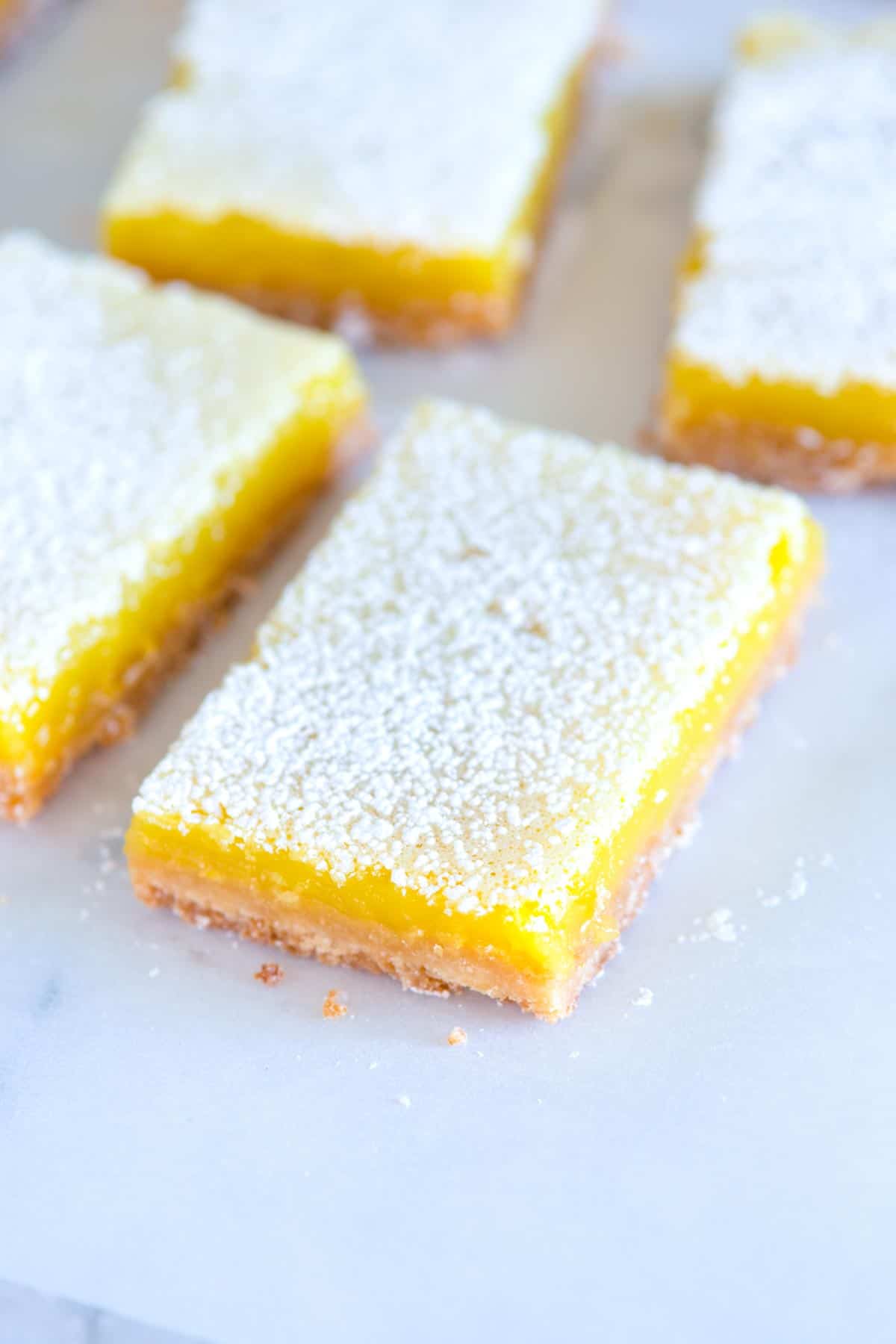 Tip 4: Let lemon bars cool before cutting. For perfect slices and that perfect creamy texture, let the bars cool completely. It’s hard, I know, but it makes a huge difference when slicing them. I usually slice into small bars or squares and dust the tops with powdered sugar.