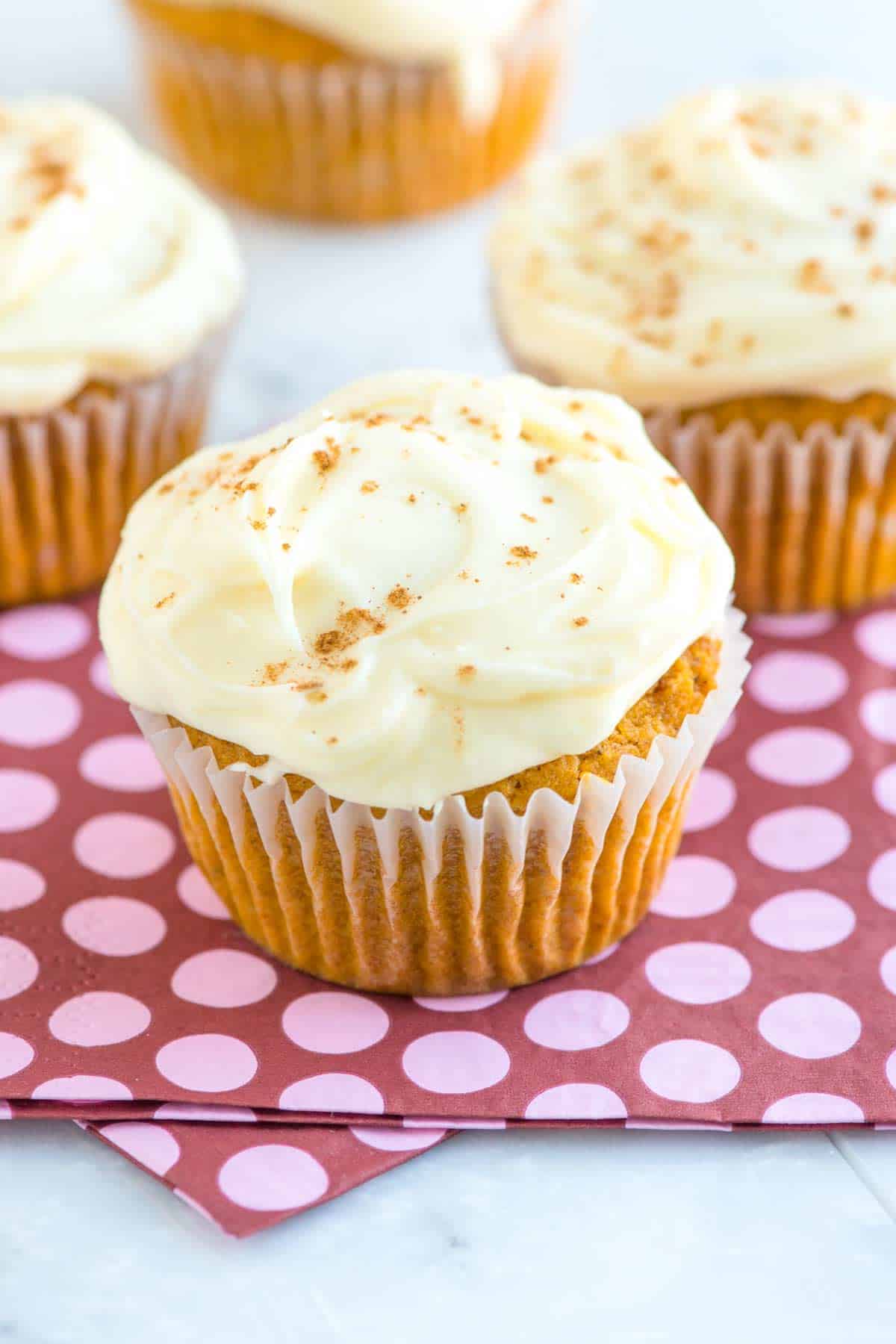 We make the batter with plenty of pumpkin puree, cozy pumpkin pie spices, and brown sugar for sweetness. Then, once baked, I love topping each cupcake with a spoonful or two of homemade cream cheese frosting. These are good!