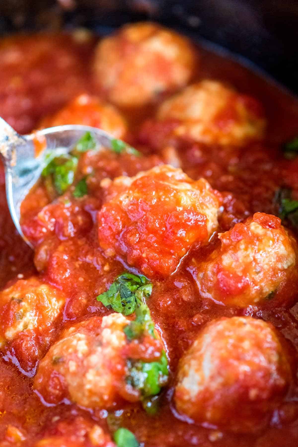 Since they gently poach in the sauce, the meatballs become extra tender and stay juicy inside. These chicken meatballs are similar to our turkey meatballs, but in that recipe, we cook the sauce and meatballs on the stove instead of in our slow cooker. For something totally different, look at our sweet and sour chicken meatballs made with a coconut lime sauce.