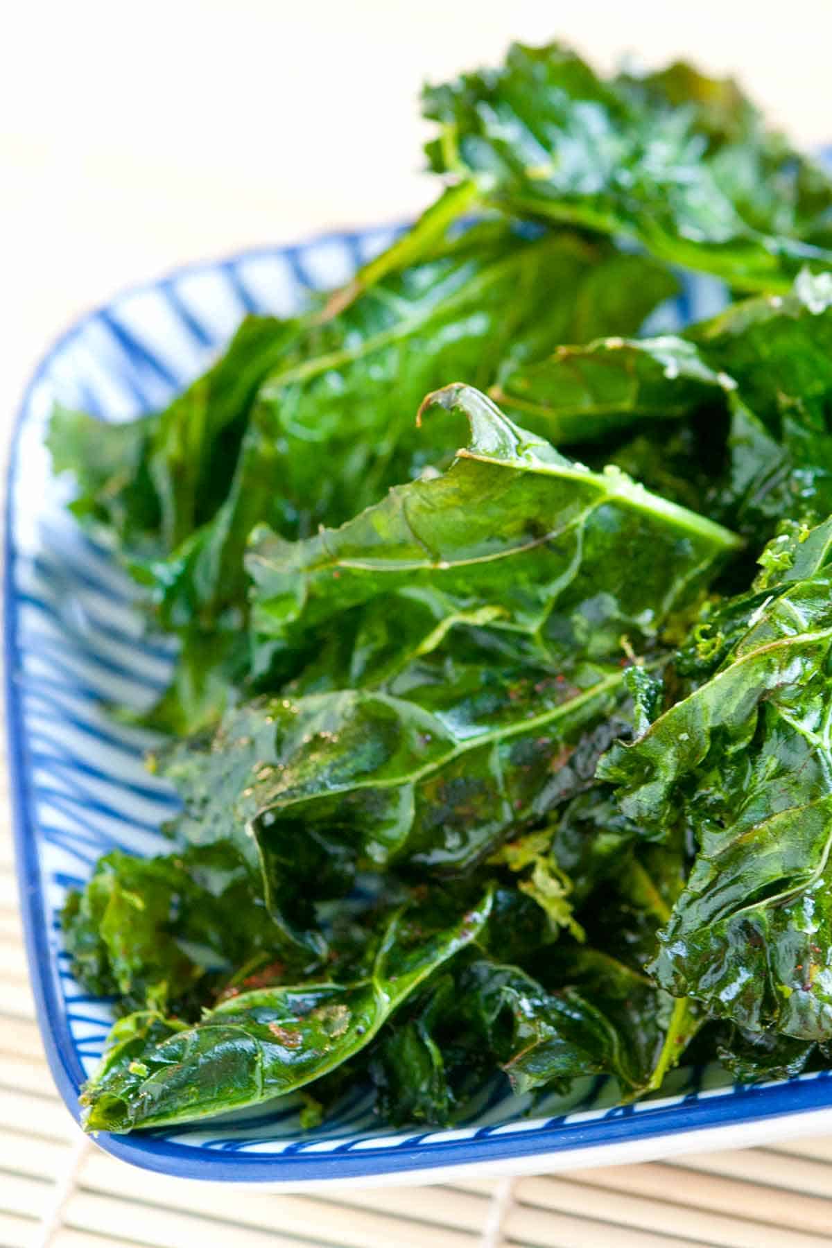 Our kale chips recipe takes 20 minutes, and you can customize the chips however you like. Check the tips for spice suggestions. Remember, for the best, most crispy kale chips, you must dry the kale very well before baking.
