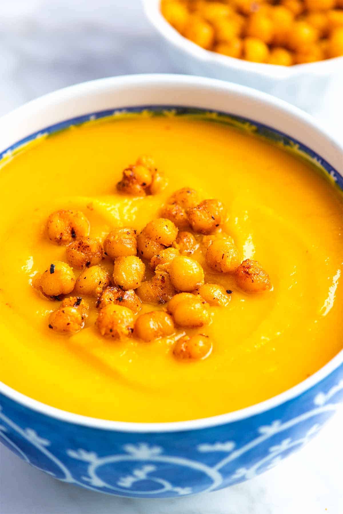 You do not need any cream or butter to make this creamy butternut squash soup! Everyone, even the meat-eaters at the table, will love it, especially when topped with our delicious crispy spiced chickpeas!
