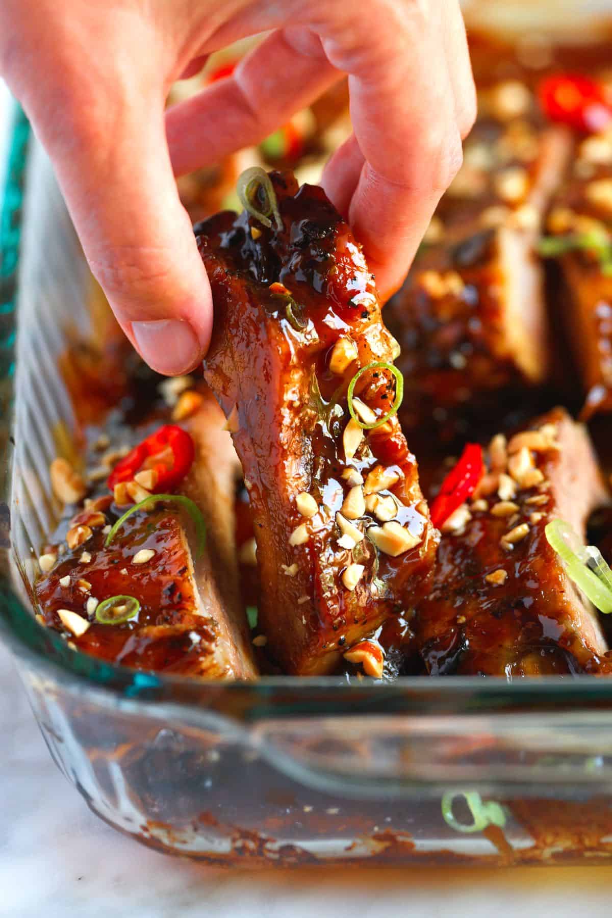 This irresistible sticky ribs recipe is one of the best things we’ve made. The ribs are unbelievably tender and coated in a delicious homemade hoisin glaze.